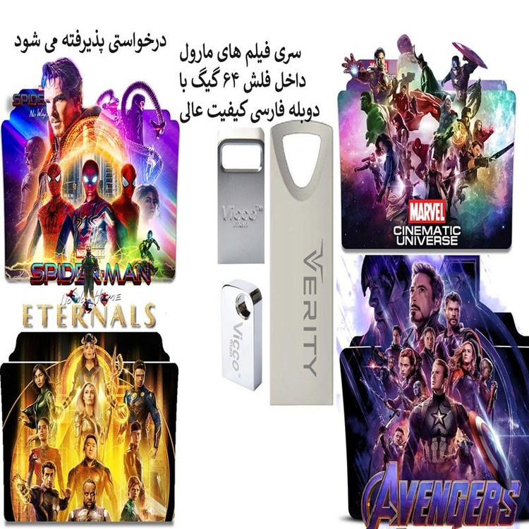فلش به صورت رندوم ارسال میشه با گارانتی مادالعمر دوبله فارسی کیفیت عالی 720 فیلم های کالکشن مرد آهنی ، کاپیتان آمریکا ، مرد عنکبوتی،دکتر استرنج،انتقام جویان ، پلنگ سیاه، محافظین کهکشان ،بیوه سیاه ، جاودانگان و ........