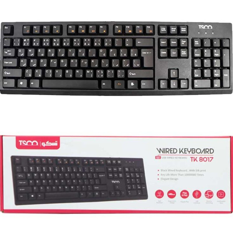 کیبورد تسکو TSCO TK 8017 کیبورد سیم دار تسکو مدل TK 8017 اتصال با سیم از طریق رابط USB 2.0 به طول 1٫8 متر، تعداد 104 عدد کلید و 12 کلید مولتی مدیا کلید تابع F یا Fu ctio ، ضربه پذیری بالای کلید ها و مقاومت در برابر رطوبت طراحی ارگونومیکی کلید ها به منظور خسته نشدن دست به هنگام تایپ کردن و …