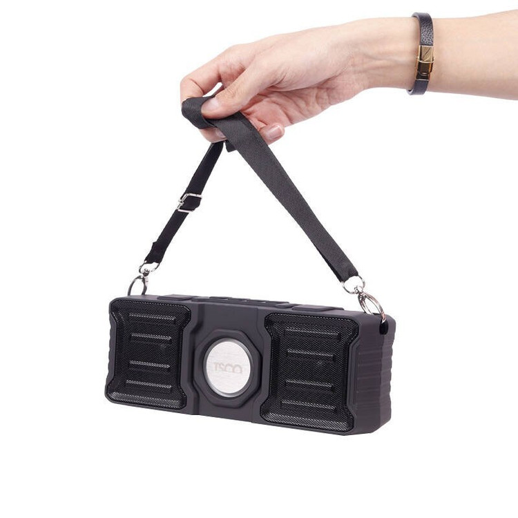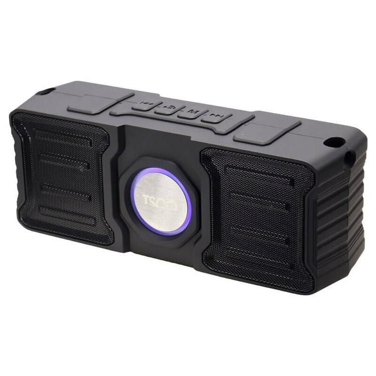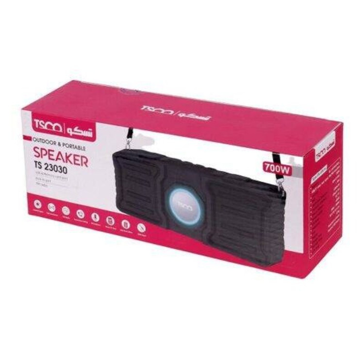 اسپیکر بلوتوثی رم و فلش خور TSCO TS23030 اسپیکر بی سیم قابل حمل تسکو مدل TS 23030 بدنه ساخته شده از جنس پلاستیک مقاوم در برابر آسیب های احتمالی در فرم مستطیل شکل دارای بند برای جابجایی راحت تر، اتصال بی سیم از طریق بلوتوث نسخه 5٫0 با برد اتصال پایدار 10 متری اتصال باسیم توسط رابط جک صوتی 3٫5 میلی متری و کابل همراه با طول 50 سانتیمتر، دارای نورپردازی داخلی تامین انرژی از طریق باتری لیتیوم یونی 1200 میلی آمپر ساعته، قابل شارژ توسط پورت میکرو یو اس بی و کابل همراه میزان دوام شارژ باتری به طور تقریبی در حالت استندبای 100 ساعت و مدت زمان مورد نیاز برای شارژ معادل 4 الی 5 ساعت امکان پخش برنامه های رادیویی با دریافت رادیو FM، دسترسی به فایل های دلخواه با اتصال فلش مموری USB و کارت حافظه microSD دارای دو درایو صدا با توان خروجی کلی 10 وات، نسبت سیگنال به نویز 80 دسی بلی و پاسخ فرکانسی قابل پوشش 20 هرتز الی 20 کیلوهرتز 600
